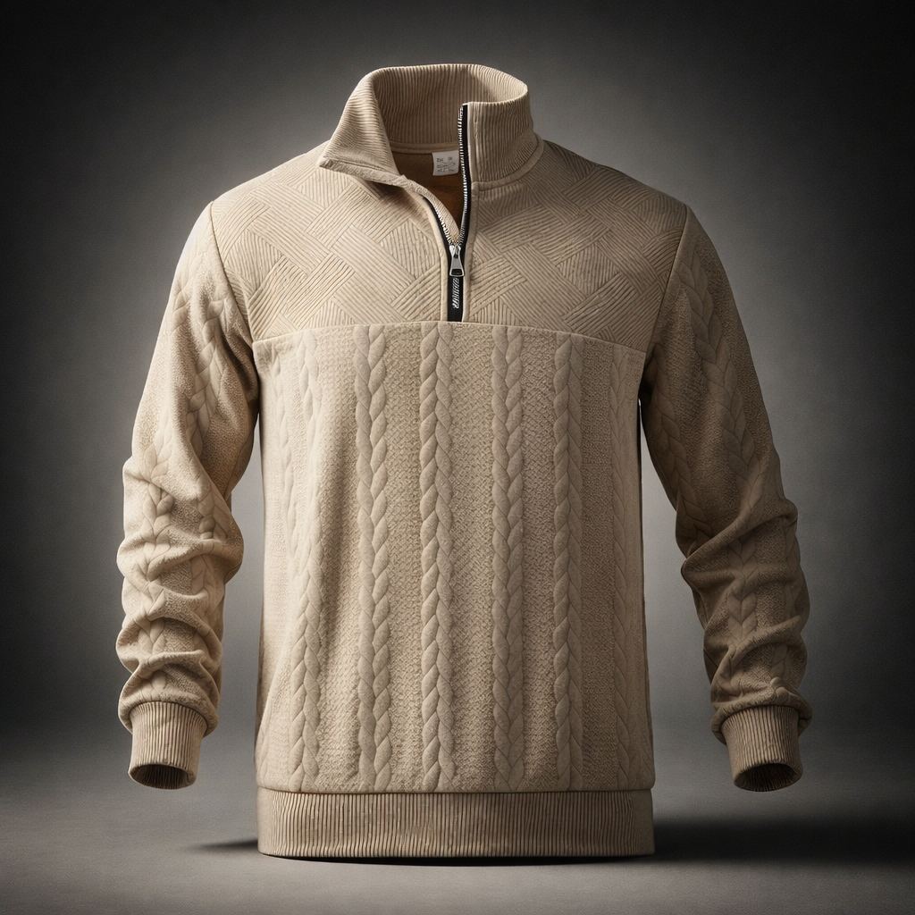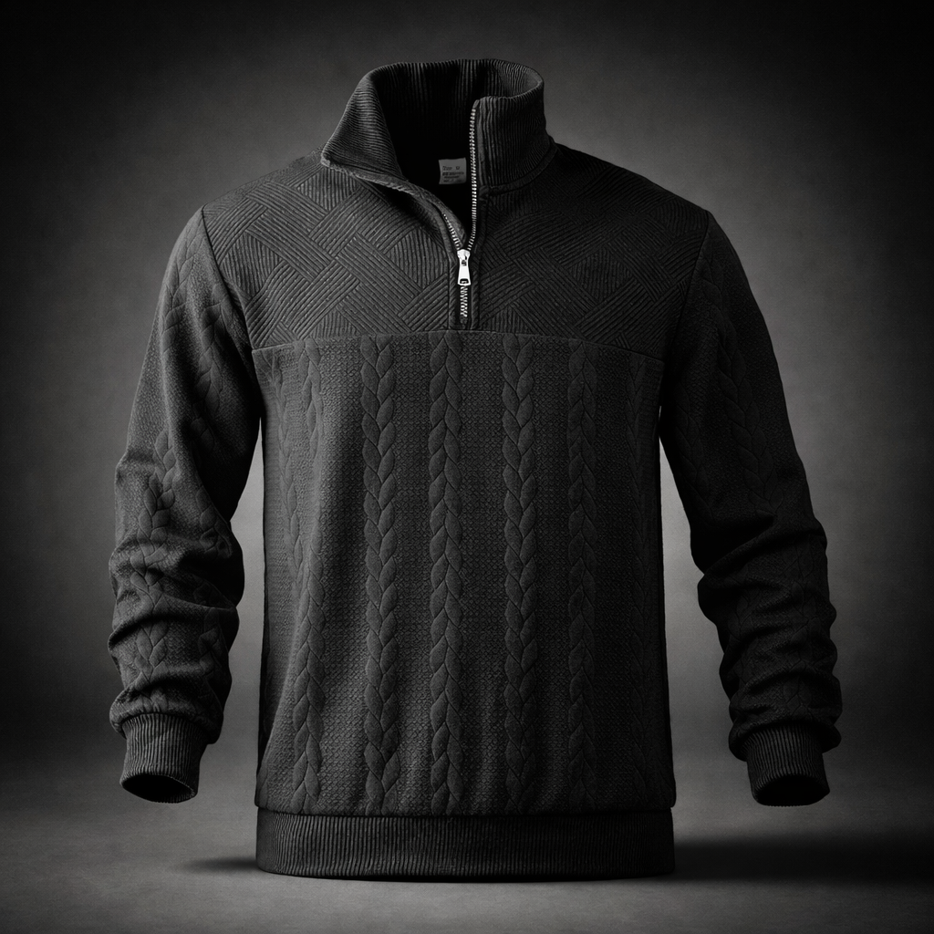 The Helios Crest Sweater features a bold textured pattern inspired by classical design, paired with a structured quarter-zip collar. Built for comfort and presence, it delivers warmth without feeling heavy.